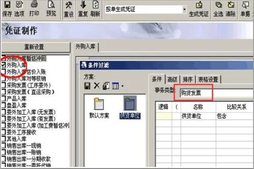 3、在出现的对话框中勾选外购入库按钮,并在弹出的条件过滤对话框中选择购货发票。