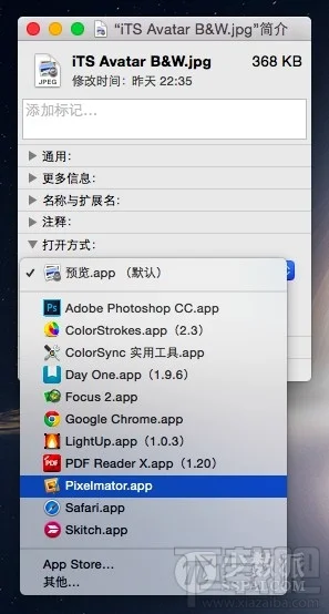 那么该文件应该在你刚刚选择的应用程序(本例为 Pixelmator)内打开,并且,该文件以后也会默认以这个应用程序打开。