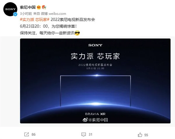 索尼终于宣布,将在6月23日晚8点,召开2022年索尼电视新品发布会。