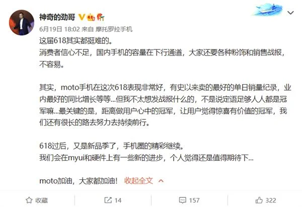 陈劲还发微博解释称, 摩托罗拉这次618表现非常好,有史以来卖的最好的单日销量纪录,业内最好的同比增长等等。