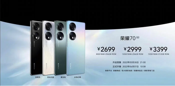 荣耀今晚正式发布荣耀70系列三款机型——荣耀70、荣耀70 Pro、荣耀70 Pro+,售价分别为2699元起、3699元起、4299元起。
