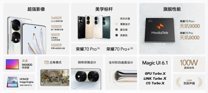 荣耀70系列全系标配5400万像素的IMX800视频主摄,拥有1/1.49英寸超大底传感器,四合一2.0μm等效像素尺寸,全像素对焦,并且首次将在Magic系列旗舰产品上的HONOR Image Engine计算影像平台带入数字系列;全系支持“Vlog主角模式”,一次拍摄即可同时生成两支独立的高清视频,一支视频为记录全景画面的视频,另一支视频为可以智能追焦主角、跟拍主角的主角画面。