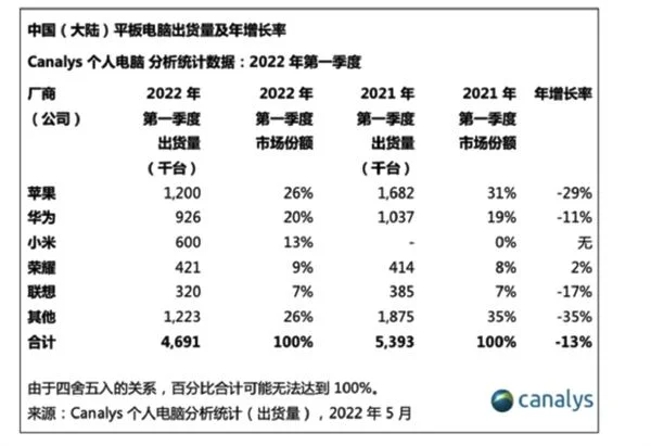 TOP5中的其他厂商依次是华为、小米、荣耀、联想,除了荣耀微增2%,其余均有不同程度下滑,当然,大环境也不好,平板市场一季度整体萎缩了13%。