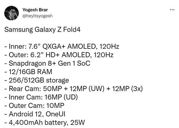 5月30日消息,爆料人Yogesh Brar在社交平台上曝光了三星Galaxy Z Fold4折叠屏的细节参数,