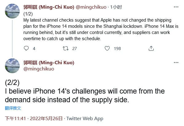 就目前已知的消息来看,全新的iPhone 14系列将依旧包含4款机型,不过苹果将准备彻底抛弃小屏的mini版本,转而由一款6.7英寸大屏的iPhone 14 Max取代。而针对当下关于该机将推迟三周发售的传闻,近日天风证券知名分析师给出了不同意见称:根据供应链的消息苹果不会改变iPhone 14发售计划,iPhone 14 Max生产虽然落后,但还在掌控之中,供应商可以加班加点生产以赶上发售日程。不过他也表示,如果需求量很高,还是会造成缺货情况的发生。