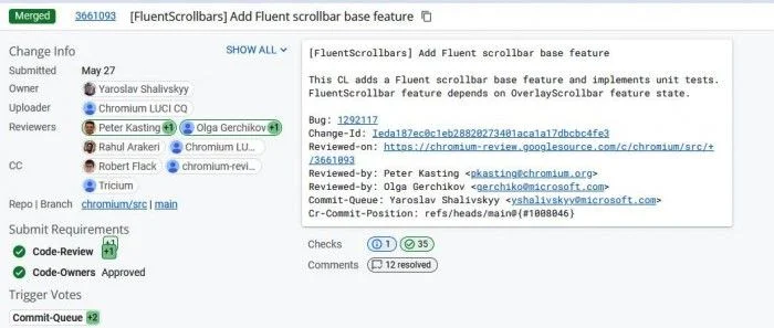 微软在代码提交中写道:“Fluent 滚动条基础功能这个 CL 添加了 Fluent 滚动条基础功能并实现了单元测试。 FluentScrollbar 功能取决于 OverlayScrollbar 功能状态”。这表明新的 Fluent 滚动条将很快在 Chrome 中进行测试(大概从 Canary 开始),但目前还没有 ETA。