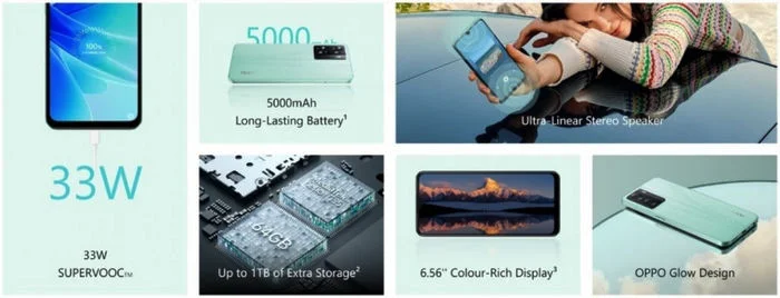 OPPO A57 4G 采用了侧面指纹、13MP 主摄 + 2MP 深度传感器组成的后置双摄,前置是一颗 8MP 摄像头,还提供了 USB-C、3.5mm 耳机孔,通过 IP54 等级和 Dirac 3.0 认证,预装基于 Android 12 的 ColorOS 12.1,提供两种颜色可选。