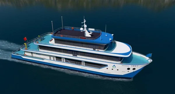 具体来看,“三峡氢舟1号”采用钢铝复合结构, 总长49.9米,型深3.2米,设计吃水1.85米,采用全回转舵桨推进。