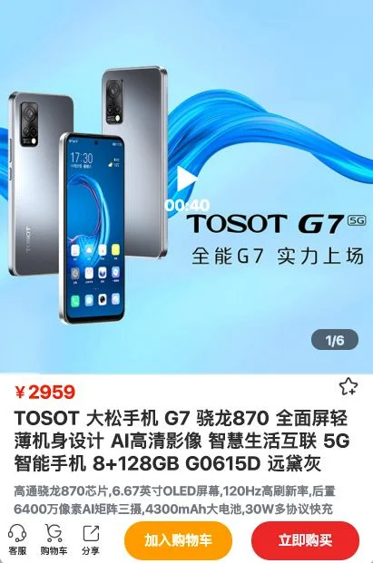 拍照方面,大松G7后置搭载6400万AI三摄,支持四像素合成技术,单位像素大小1.4μm。