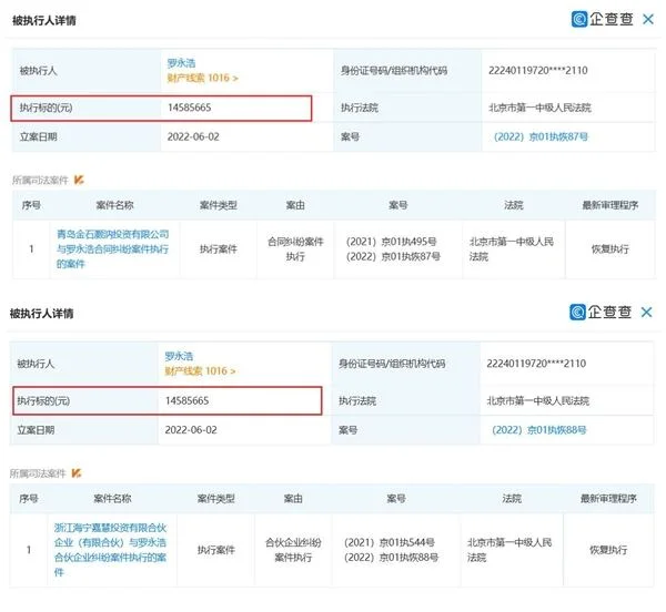 其中一条是 罗永浩与青岛金石灏汭投资有限公司的合同纠纷案, 案号(2022)京01执恢87号,执行标的为14585665元。
