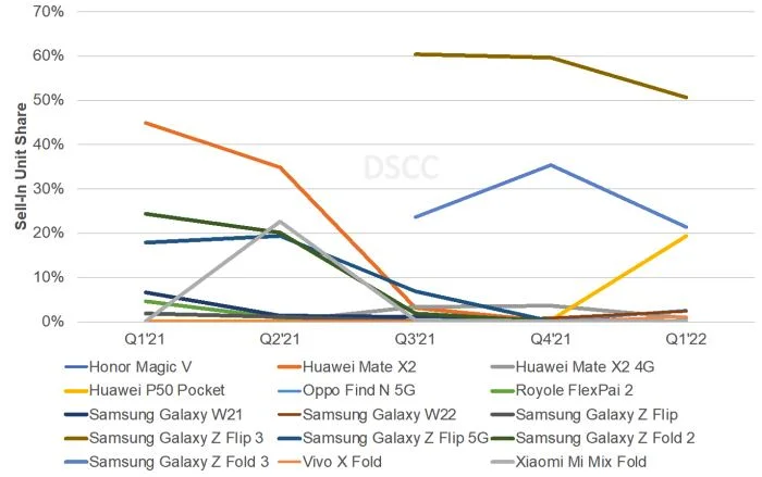 可以想象,三星仍然以很大的优势成为市场领导者,它控制了74%的市场,而 华为 则位于其次,华为的市场份额实际上也在上升,今年前三个月,该公司占可折叠手机出货量的20%。几乎所有的功劳都归功于华为P50 Pocket。正如之前所说,翻盖式折叠屏手机大受欢迎。