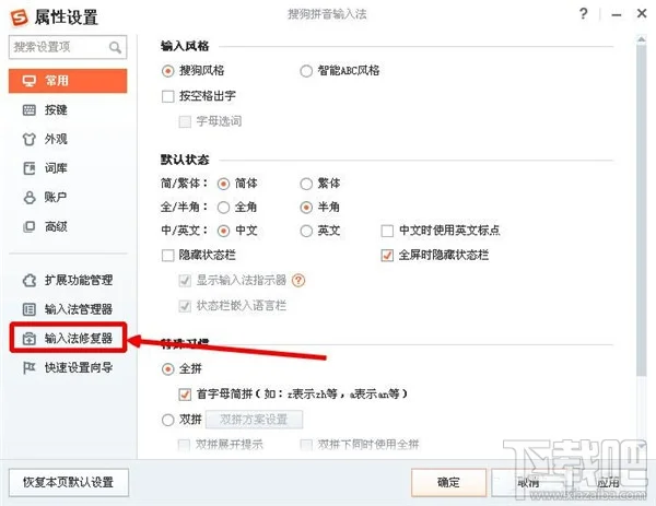 右键输入法-设置属性-输入法修复器-修复;