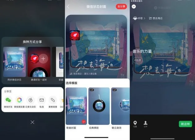 目前网易云音乐提供多套微信状态封面模板可供选择,分别为:歌曲封面(默认)、经典黑胶盘、歌曲歌词、鲸云音效、播放控件、私人FM及音乐心情等。通过网易云音乐分享微信状态,即可向微信好友展示网易云音乐专属听歌状态。
