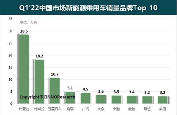 2022年第1季度, 中国市场新能源乘用车纯电动持续走强份额超八成,从品牌Top 10排行榜上看: