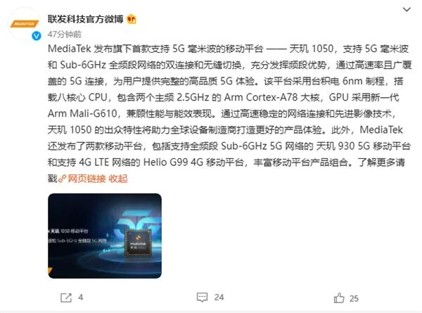 联发科官方终于宣布,推出旗下首款支持5G毫米波的移动平台:天玑1050。