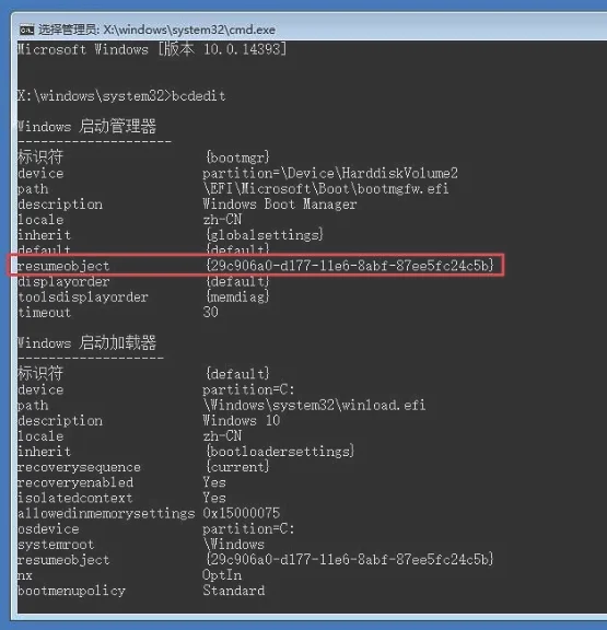 在命令提示符中输入“bcdedit”(不含引号, 下同),找到名为“resumeobject”的选项,记录下后面的一长串字符(即GUID)。