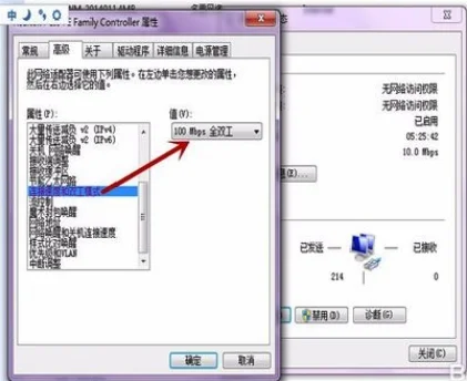4、在属性界面里面找到“配置”,点击“高级”,在高级界面上找到“连接速度与双工模式”,点击值,将值设置为“100Mbps/Full Duplex”,点击应用即可
