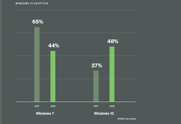 据Duo Security发布的数据报告,以1100万企业客户为样本做的统计显示,Windows平台的影响力正在削弱,今年的市场份额下滑到了65%,而macOS则悄然增长,达到30%。