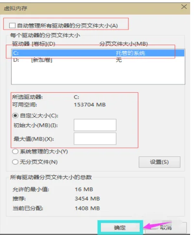 5.将虚拟内存界面上的自动管理XXX卡按摩的勾去除,,选择“自定义”,托管的系统选择C盘。