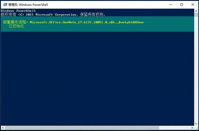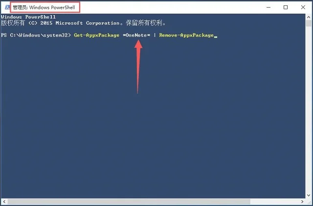 03.以卸载OneNote为例,在“管理员:WindowsPowershell”窗口中,复制卸载OneNote对应的命令,粘贴后回车,如图所示。