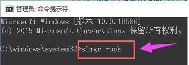 在命令指示符框中输入:slmgr -upk,回车(清空原有密钥)