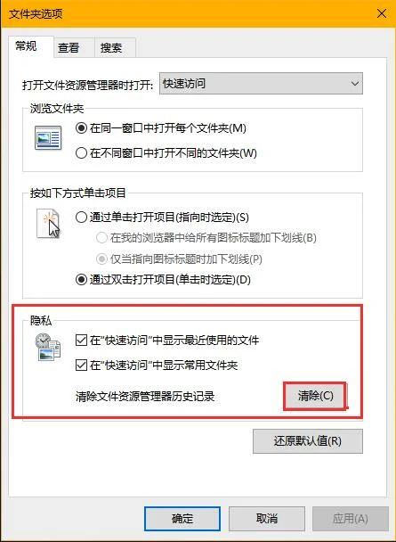 具体方法如下: 1.点击桌面上的【此电脑】或者电脑任务栏上的【文件资源管理器】图标,打开文件资源管理器。 2.在文件资源管理器窗口中,左键点击窗口左上方的“查看”按钮,然后点击右侧的“选项”按钮。 3.在文件夹选项的常规设置窗口中,把“隐私”分类下的两小项前面的小框内的“√”取消,再左键单击右下角的“清除”按钮,清除文件资源管理器历史记录。 4.清除完文件资源管理器历史记录后,先左键窗口下方的“应用”,再左键“确定”即可。