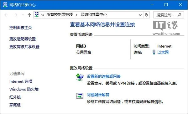 在Win7中打开网络和共享中心,在活动网络中点击网络图标后就可以直接修改网络图标和名称,不过在Win10中活动网络列表中已经没有了网络图标,自然前面的方法就不奏效了。