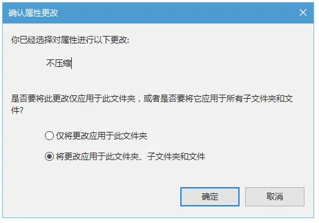 4、在属性窗口点击“确定”,此时会询问是否将此设定应用到子文件夹和文件,如果你想彻底解除压缩和加密,可以直接点击“确定”,否则在选择“仅将更改应用于此文件夹”后,再点击“确定”,如下图——
