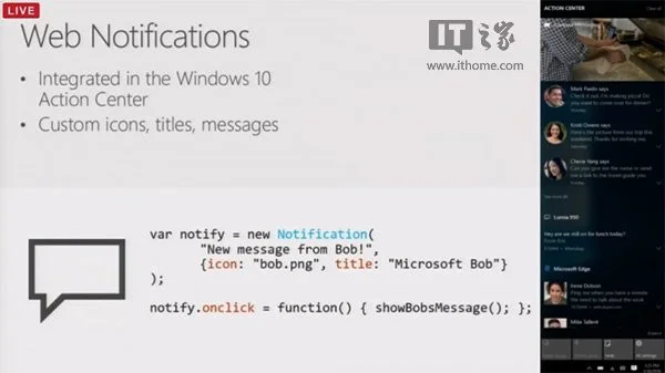 在举行的Edge Web峰会中,微软Edge开发团队宣布即将为Win10Edge浏览器带来Web通知功能。Web通知是HTML5中的一个消息通知API,W3C已经为该API制定了标准,目前Chrome等内核浏览器已经采用了该标准。