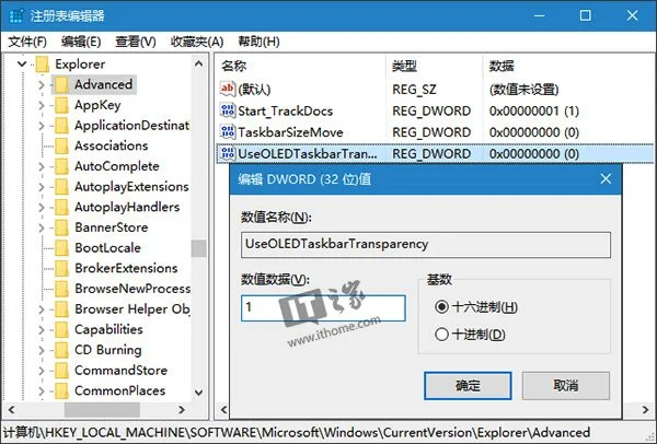如下图所示,在右侧新建名为UseOLEDTaskbarTransparency的DWORD(32位)值: