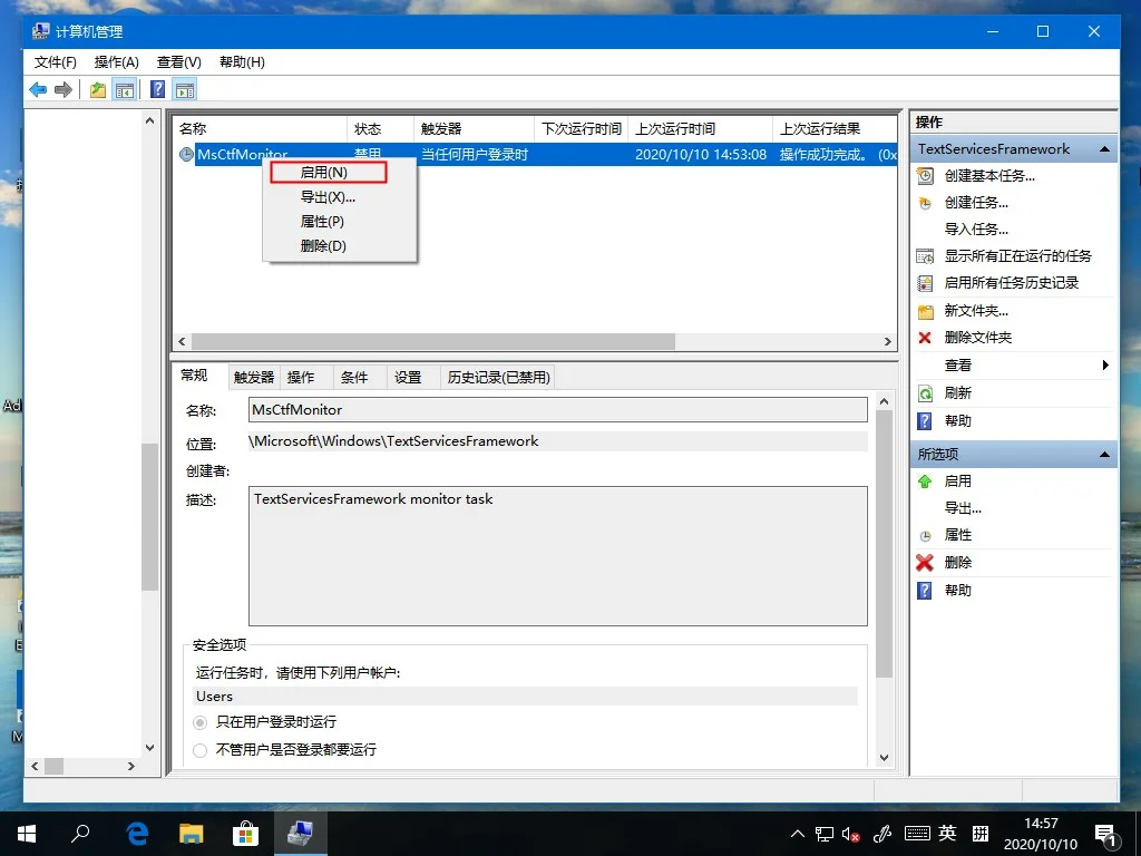 4、找到TextServicesFramework monitor task选项后,在选项处点击鼠标右键”启用“。