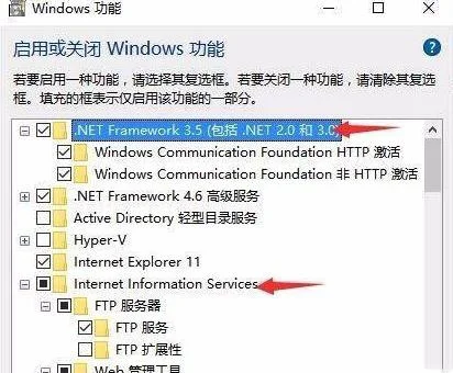4、设置.NET和IIS等Windows功能,勾选 .NET Framework 3.5 (包含.NET 2.0和3.0)、勾展开 Internet Lnformation services — FTP服务,勾选 FTP 服务;