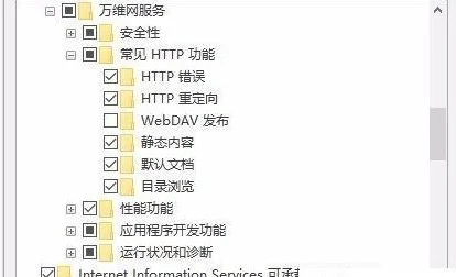 展开 常见HTTP 功能 ,勾选 HTTP 错误、HTTP 重定向、静态内容、默认文档、目录浏览;