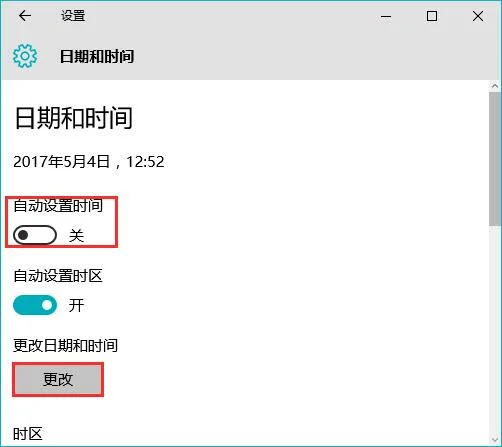 2、在下面将【自动设置时间】关闭,点击【更改】;
