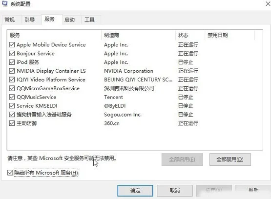 二:将第三方的优化软件关闭掉,将系统中所有的第三方软件关闭,win+R 组合键打开运行,输入 msconfig 点击确定,切换到【服务】,勾选【隐藏所有的Microsoft 服务】,点击【全部禁用】;