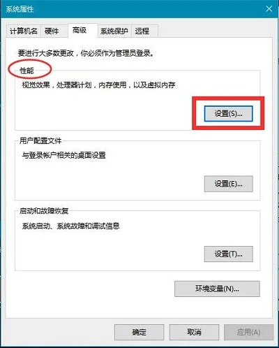 3、在系统属性“高级”选项卡下,点击打开“性能”下方的“设置”,如图。