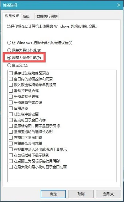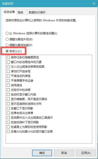 也可以选择“自定义”然后将不需要的特效功能勾选去掉,如去掉最底部“在最大化和最小化时显示窗口动画”前面的勾,并点击底部的“确定”保存即可,如图。