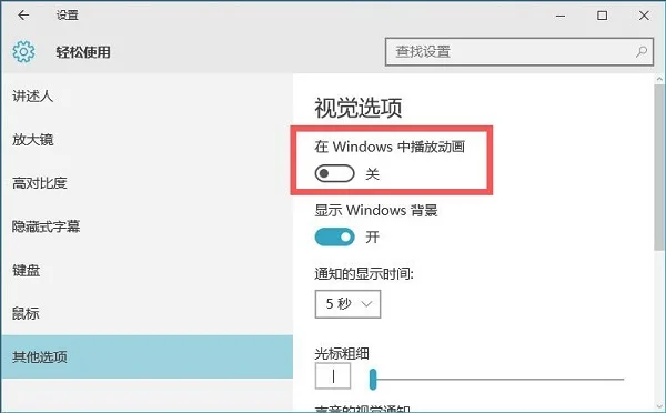 三、在轻松设置界面,点击底部的“其它选项”,然后在右侧的视觉选项下面就可以看到“在Windows中播放动画”,默认这项是开启的,我们选择将其“关闭”就可以关闭Win10窗口动画效果了。