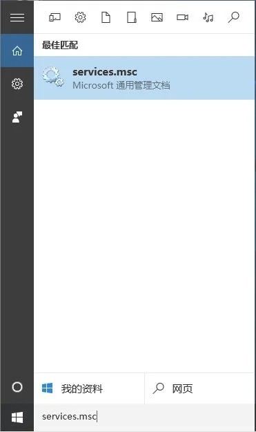 1、在W10系统点击“开始——搜索”,在搜索框中输入“services.msc”命令;
