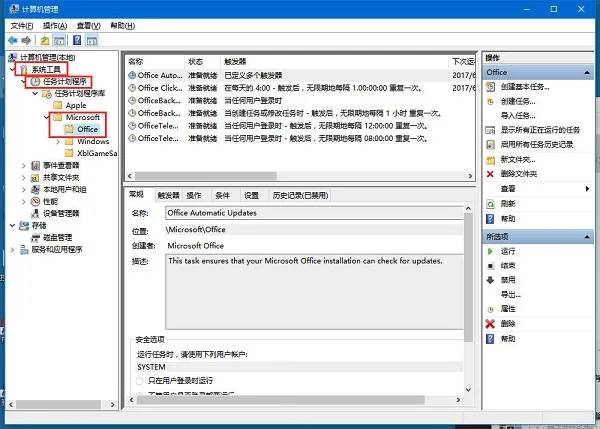 2、选择“系统工具” – “任务计划程序” – “任务计划程序库” – “Microsoft” – “Office”。