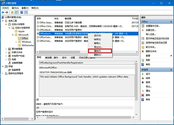 4、右击 “OfficeBackgroundTaskHandlerRegistration” 选择属性。