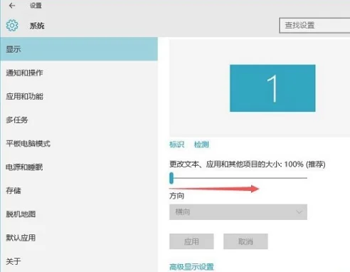 在“设置”窗口中,可以看到右侧的“更改文本、应用和其他项目的大小”,用户用鼠标拖动滑条即可任意调整