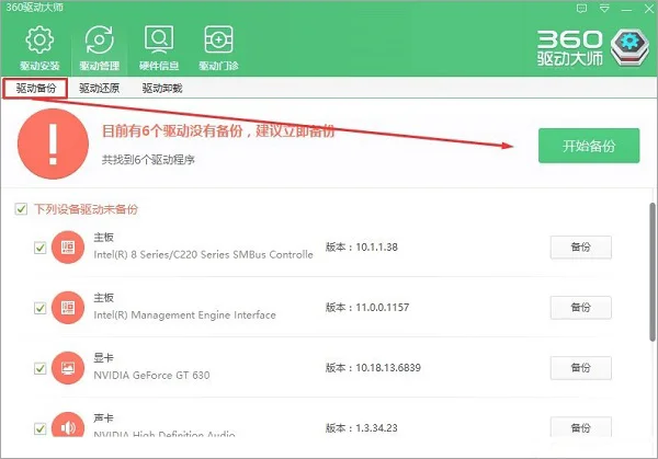 3、在下面点击 驱动备份 ,然后将需要备份的驱动勾选起来,点击【开始备份】即可!