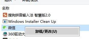 2、在程序和功能 界面找到 微信,在微信上单击右键,选择【卸载/更改】,如图: