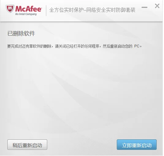 重启后就不再有迈克菲(Mcafee)这个软件。也不会再让迈克菲(Mcafee)占用你宝贵的系统资源。