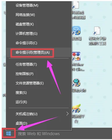 首先点击电脑“开始”,选择“命令提示符(管理员)”。