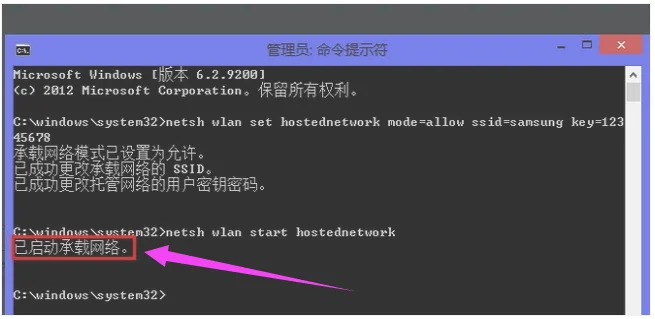然后窗口中会出现提示“已启动承载网络”。