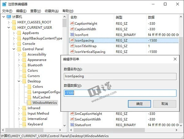 3、你会在右侧找到名为IconSpacing的字符串值,该值表示桌面图标之间的水平间距。其算法为: