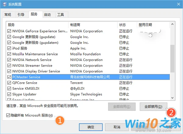 2、点击“服务”选项卡,首先勾选“隐藏所有Microsoft服务”,然后点击“全部禁用”按钮,再点击“应用”,如下图——