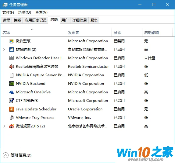 4、在任务管理器中点击“启动”选项卡,把所有第三方启动项全部禁用,如下图——